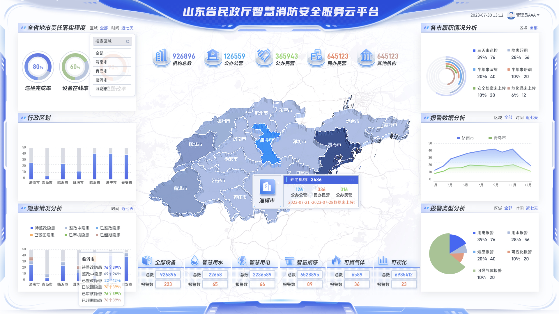 “山東省民政廳智慧消防安全服務云平臺”采取信息化手段來實現(xiàn)對17地市的養(yǎng)老機構的隱患排查進行分流推送、對隱患整改進度進行管控,建立數(shù)據(jù)庫和物聯(lián)網(wǎng)監(jiān)管平臺,對民政養(yǎng)老進行風險評估、預警,給民政廳和各地市民政局提供抓手進行精準監(jiān)管,同時系統(tǒng)信息可作為安全隱患排查、整改管理和處罰依據(jù),形成閉環(huán)式管理,為政府掌控安全形勢,提供科學依據(jù),從而形成“人防+技防”的立體化防控體系。
