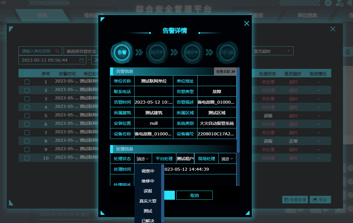 消防控制室值班機器人系統(tǒng)還具有消防遠程聯(lián)網(wǎng)功能,實時接收、解析、顯示、上傳報警主機的報警信息到平臺,根據(jù)接收到的信息類型對火災(zāi)自動報警控制器進行自動操作:平臺遠程值班人員只需要點擊相應(yīng)按鈕即可一鍵處置,值班機器人將立即按照預(yù)設(shè)邏輯主動對主機進行各種操作,如復(fù)位報警主機、切換手自動狀態(tài)等。