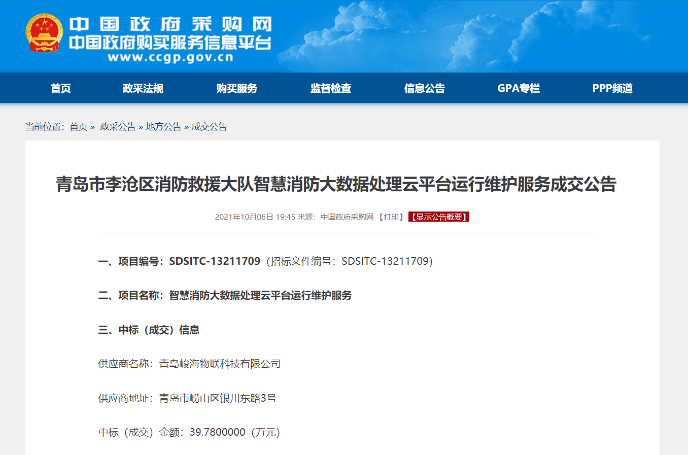 中國(guó)政府采購(gòu)網(wǎng):http://www.ccgp.gov.cn/cggg/dfgg/cjgg/202110/t20211006_16974121.htm