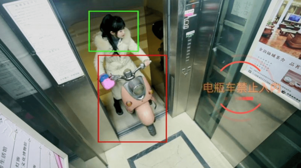 系統(tǒng)前端設(shè)備嵌入電瓶車識(shí)別算法,對(duì)電瓶車精確檢測(cè)分析,可實(shí)現(xiàn)對(duì)電瓶車的分析識(shí)別,實(shí)時(shí)預(yù)警周界區(qū)域內(nèi)電瓶車闖入事件。當(dāng)有電瓶車進(jìn)入電梯監(jiān)測(cè)范圍內(nèi)可進(jìn)行智能報(bào)警提示,同時(shí)電梯發(fā)出語(yǔ)音信息:“請(qǐng)將電瓶車推出電梯,謝謝合作”。
