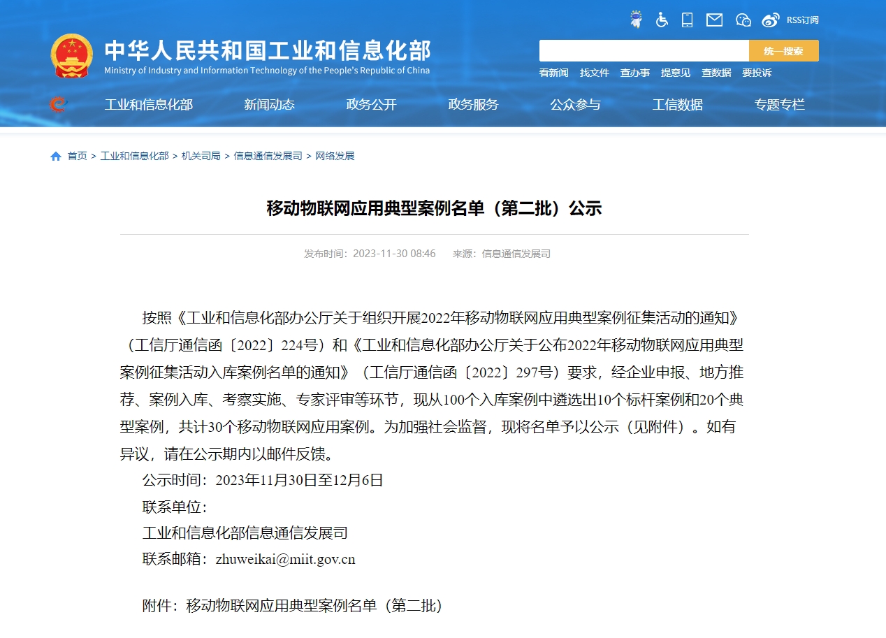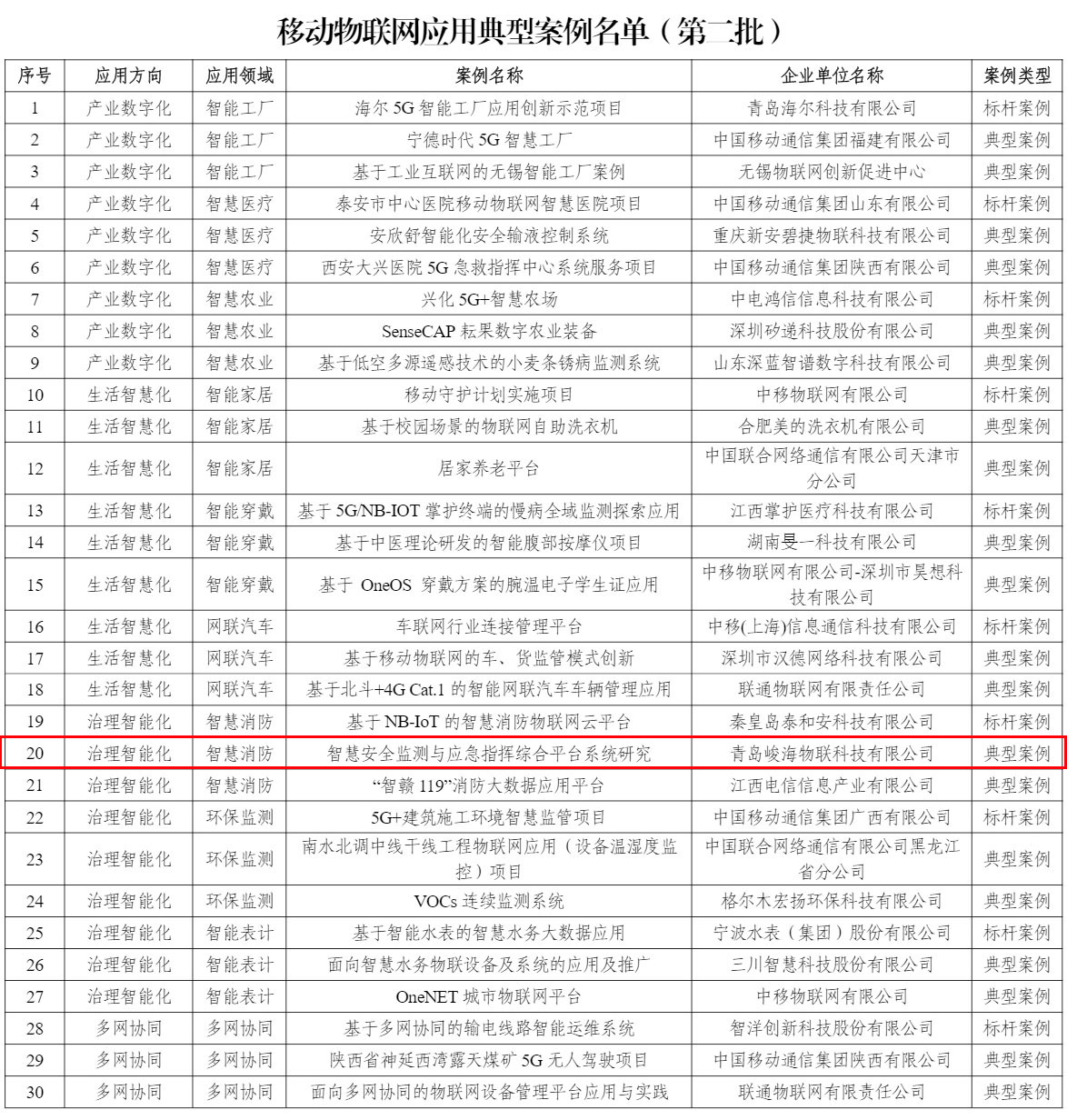 2023年11月30日,國家工業(yè)和信息化部在其官方網(wǎng)站對(duì)2023年《移動(dòng)物聯(lián)網(wǎng)應(yīng)用典型案例名單(第二批)》進(jìn)行公示,經(jīng)地方推薦、案例入庫、考察實(shí)施和專家評(píng)審等環(huán)節(jié),從100個(gè)入庫案例中遴選出10個(gè)標(biāo)桿案例和20個(gè)典型案例,共計(jì)30個(gè)移動(dòng)物聯(lián)網(wǎng)應(yīng)用案例。其中,峻海物聯(lián)在智慧消防領(lǐng)域的“智慧安全監(jiān)測與應(yīng)急指揮綜合平臺(tái)系統(tǒng)研究”成功入選典型案例。