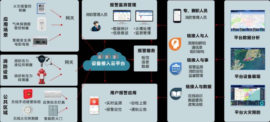 智慧消防的核心價(jià)值在于以“防消結(jié)合”為指引,以“人防+技防+智防”為技術(shù)融合,搭建“防消一體化”綜合監(jiān)管平臺(tái)。