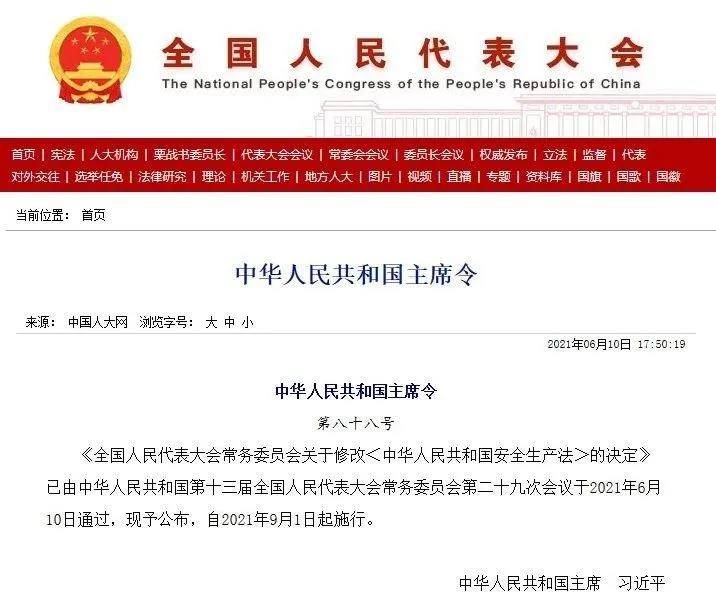 《全國人民代表大會常務(wù)委員會關(guān)于修改<中華人民共和國安全生產(chǎn)法>的決定》已由中華人民共和國第十三屆全國人民代表大會常務(wù)委員會第二十九次會議于2021年6月10日通過,現(xiàn)予公布,自2021年9月1日起施行。