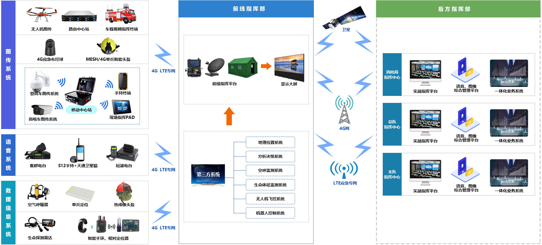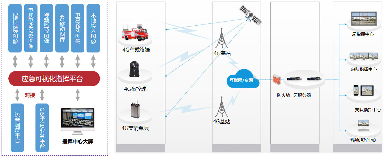 “綜合性應急救援指揮平臺”以多種通信網(wǎng)絡為依托,建立圖像綜合管理、語音綜合管理、數(shù)據(jù)綜合管理等管理平臺,融合移動衛(wèi)星通信系統(tǒng)、4G/5G移動通信系統(tǒng)、視頻會商系統(tǒng)、監(jiān)控聯(lián)網(wǎng)系統(tǒng)、模擬語音集群系統(tǒng)、數(shù)字語音集群系統(tǒng)、GIS地理信息系統(tǒng)等多個原本各自分散獨立的子系統(tǒng).實現(xiàn)固定與機動、空中與地面、有線與無線的完美融合,多種音視頻資源通過一個平臺逬行統(tǒng)一管理,分級分權調(diào)用。